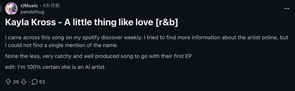 いやいや、Webサイトもあるし、インスタもあるし、Spotifyでおすすめされてるのに、AIってあり得るの?Redditの人たちの早とちりでは??と希望を捨てずにさらに調べると・・・