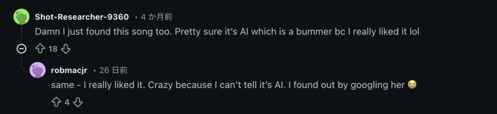 「うわぁ、私もこの曲を見つけたところ。好きだったからAIで残念。笑」